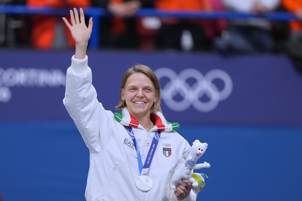 Arianna Fontana con la medaglia d’argento al collo a Milano, 12 febbraio 2026 (AP Photo/Natacha Pisarenko)