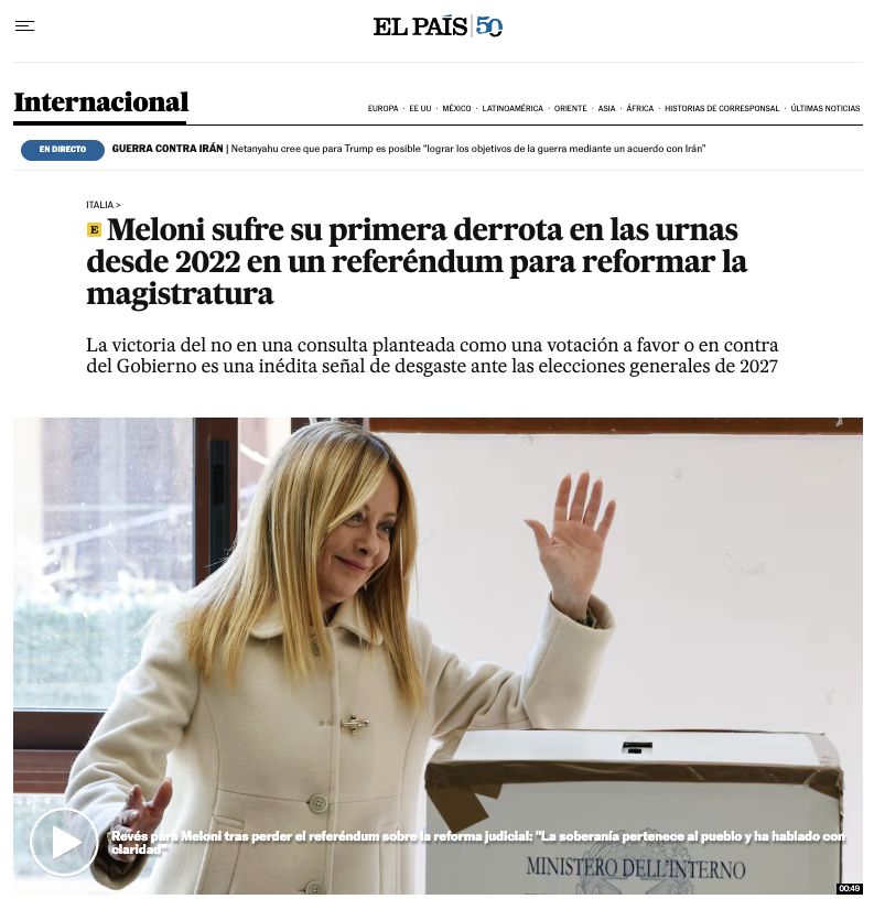 Il quotidiano spagnolo El País sostiene che «Meloni ha subito la sua prima sconfitta elettorale dal 2022».