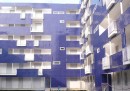 Le tre palazzine appaiono costruite in maniera molto semplice, ma alle pareti coperte d’intonaco bianco si contrappone un unico elemento molto potente: un uso diffuso e inaspettato di piccole mattonelle blu che rivestono le facciate sul cortile interno quasi integralmente e che appaiono con ampi riquadri sui fronti esterni verso strada. Il blu cobalto che non ti aspetti in questa terra dura, che non concede aria e tempo alla bellezza, è una dichiarazione poetica e politica straordinaria che dichiara che le case popolari devono essere innanzitutto belle e civili, che rappresentano un elemento di resistenza in un territorio violato e degradato dalla storia e dalla malavita.