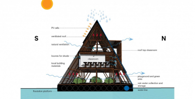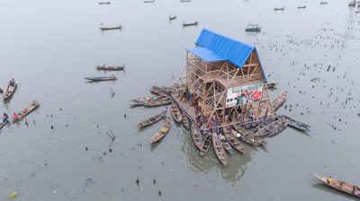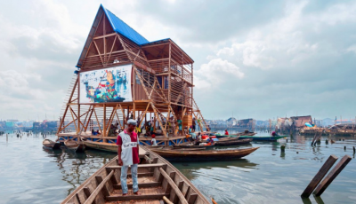 Immaginate adesso che, nel mezzo di quelle acque dense e abitate di vita, ci sia qualcosa di inaspettato che attira l’attenzione. Un grande edificio galleggiante dalla forma triangolare su tre piani; tetti blu di metallo, una base galleggiante composta da 256 elementi di plastica riciclati, e struttura a vista in legno. Intorno tante barche vanno e vengono: portano bambini con i loro zaini e i quaderni per i compiti. Quello strano edificio è la nuova scuola e “public centre” di Makoko progettata dal giovane architetto nigeriano Kunlé Adeyemi fondatore di NLE’ NLE’ con studi a Lagos e Amsterdam, e uno degli esempi più riusciti di una nouvelle vogue di progettisti e nuovi committenti che, lentamente, cambieranno parte del paesaggio africano.
