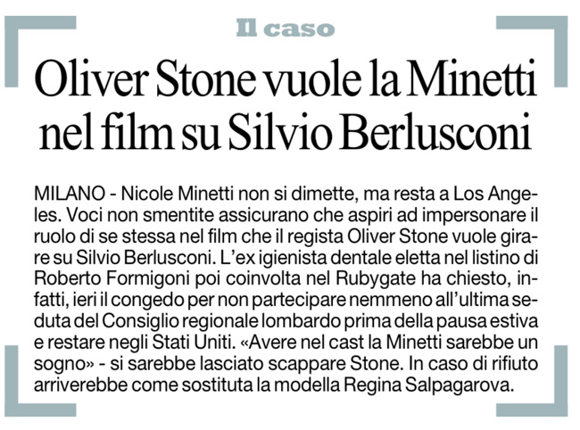 Ora, tutto suona sbilenco lontano un miglio, e così ho fatto una minima ricerca. E su Twitter mi hanno gentilmente segnalato che la notizia del film su Berlusconi di Oliver Stone è un riuscito pesce d’aprile dell’anno scorso (che ingannò molti), che aveva preso a sua volta spunto da una notizia smentita addirittura tre anni fa.
