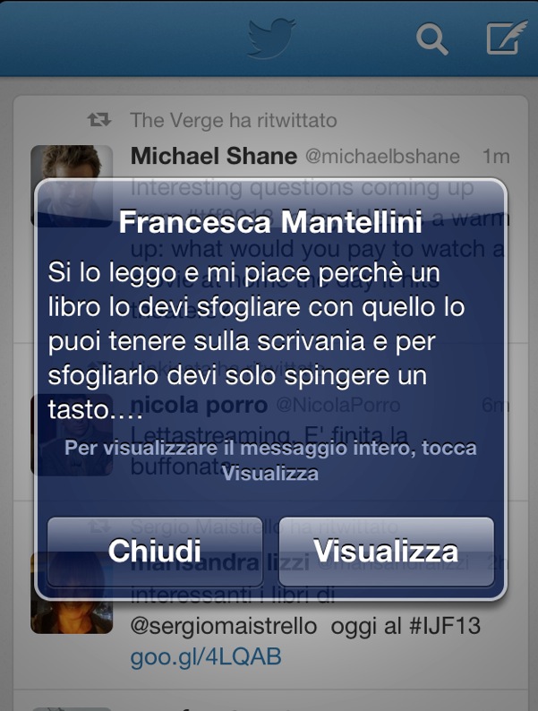 Cambiare, magari anche non tutto ma qualcosa, per dirla con un Riccardo Luna moderato, non invocare subito i massimi sistemi (democrazia, libertà, conoscenza ecc) applicati al web, ma occuparsi di questioni più terra terra, per rivedere il titolo di Riotta, ma soprattutto iniziare a guardare la tecnologia che ci cresce accanto anche con occhi diversi dai nostri. Io questa sera mi affido ad un messaggio ricevuto da mia figlia decenne mentre la settimana scorsa ero fuori casa. Leggere per la prima volta Harry Potter su Kindle? Ecco perché. E per favore non ditelo a Roberto Calasso.