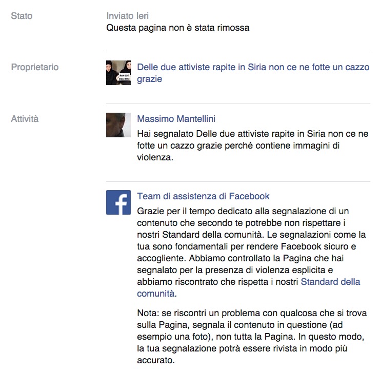 Com’è nell’ordine delle cose molte persone ieri hanno messo “mi piace” sulla pagina FB in questione, molte altre hanno segnalato la pagina a Facebook perché la rimuovesse. Per la prima volta in vita mia l’ho fatto anch’io, più che per curiosità che per altro, cercando di farlo con un minimo di accuratezza, soprattutto tenendo d’occhio, più che la mia indignazione, gli “Standard di servizio della piattaforma” che Facebook propone.