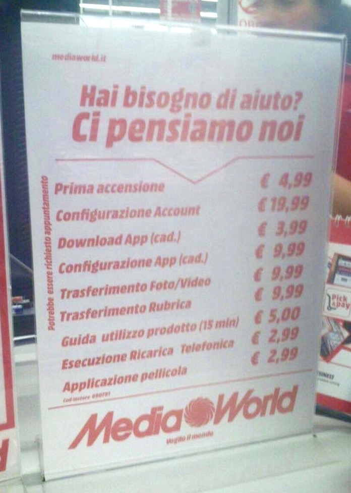 Circola molto in questi giorni questa foto scattata in un negozio Mediaworld: elenca i costi delle prestazioni di assistenza alla clientela per eseguire procedure che a noi forse sembrano intuitive e semplicissime. Di fronte a questa immagine gli sciocchi su Internet si indignano tout court per l’esosità delle richieste (ma di nuovo si tratta di una faccenda di prospettive, molte di simili prestazioni sono semplici solo per quelli che le sanno fare) quelli dotati di senso pratico capiscono al volo che il tempo lavorativo dei commessi ha un costo e non può essere interamente assorbito dagli aiutini alla vasta clientela che non sa.