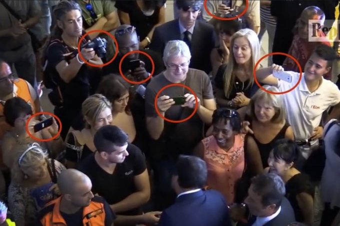 Ai funerali di Genova ha avuto grande rilievo e raccolto unanimi critiche la foto del selfie della ragazza con Salvini, pochissimi hanno commentato un altro scatto in cui molte persone, in gran parte sorridenti, stanno documentando l’arrivo del politico al funerale.