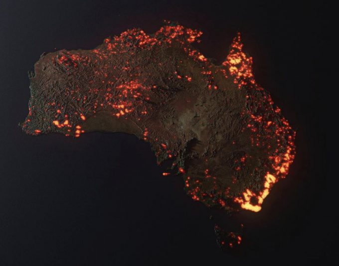 Come molti si affretteranno a spiegare, sempre nell’illusione consolante che serva davvero a qualcosa provare ad opporsi ai fenomeni virali in rete, quella foto non è una foto. È, tecnicamente parlando, una visualizzazione tridimensionale, prodotta dal suo autore, aggiungerei con un sufficiente grado di leggerezza, utilizzando dati liberamente disponibili in rete. Ad un’immagine della Nasa dell’Oceania sono stati aggiunti, in un formato grafico accattivante e con vistose esagerazioni di rendering, i dati degli incendi occorsi da quelle parti nel periodo 5 dicembre 2019 – 5 gennaio 2020.
