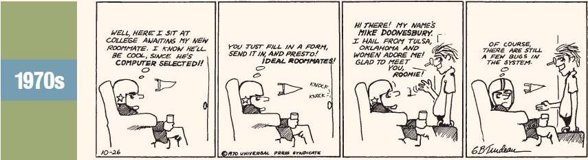 In realtà le cose sono ben diverse: Trudeau è un disegnatore coi fiocchi, e la sua abilità nel costruire scene e simboli fatti di segni grafici è stata decisiva, persino crescente nel tempo. Prendiamo 4 strisce, una per decennio, come ha fatto l’editore Andrews McMeel per promuovere il volume celebrativo “40: A Doonesbury Retrospective“, e giochiamoci un po’.