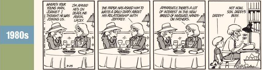 Con la pubblicazione quotidiana, dal 1970, avvengono due piccoli ma significativi cambiamenti. Da un lato Trudeau guarda qua e là a un grande delle strisce: lo Schulz dei Peanuts, che allora avevano iniziato a spopolare davvero, e di cui qualche indizio si vede nella diversa stilizzazione dei volti, lievemente arrotondati (guardate gli occhioni del bimbo). Dall’altro entrano in scena nuovi personaggi decisamente iconici, come Joanie Caucus e le sue occhiaie da donna di mezza età affaticata dalla vita.