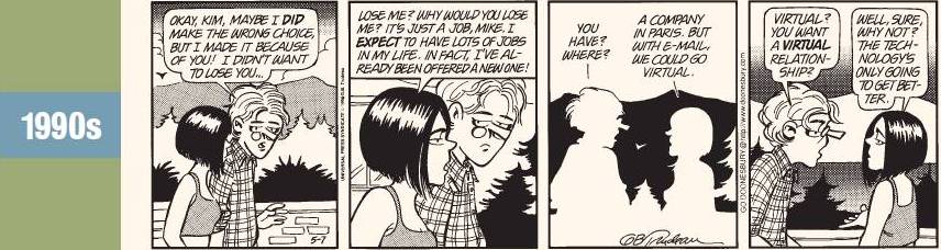 Nel corso degli anni ’80, come raccontato da Brian Walker nel bel volume “Doonesbury and the Art of G.B. Trudeau“, si consolida la collaborazione agli inchiostri con Don Carlton (eh già, anche Trudeau non lavora da solo), che tende ad accrescere la precisione della linea, sia marcando i contorni che arricchendo i dettagli. È così che, verso la fine del decennio, i retini tipografici aggiungono a Doonesbury un feeling più contemporaneo, fatto di texture più moderne e rigorose – dagli abiti agli sfondi – e in grado di suggerire anche una maturità più “strutturata” dei personaggi ormai tutt’altro che ragazzini al college.