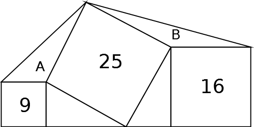 La figura qui sotto mostra tre quadrati di area 9, 16 e 25 e alcuni triangoli. L’area del triangolo A è maggiore o minore di quella del triangolo B?