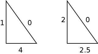 Il triangolo rettangolo disegnato qui sotto a sinistra non può avere come lati 1, 4, 0; però è possibile aggiungere a tutte e tre i numeri una stessa cifra (2) per avere un vero triangolo rettangolo di lati 12, 4², 20. Riuscite a fare la stessa cosa con il triangolo di destra, di “lati” 2, 2.5, 0?