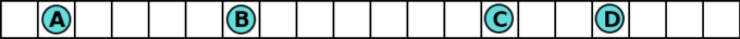 Marta e Maria sono davanti a una riga di venti caselle dove sono posti quattro gettoni A, B, C, D come in figura. Ogni mossa consiste nel muovere verso destra un gettone di un numero a scelta di caselle, senza però raggiungere o superare un altro gettone. Chi non ha più mosse a disposizione, perché i gettoni sono nelle ultime quattro caselle, perde. Comincia a giocare Marta. Può vincere? Se sì, qual è la sua strategia?