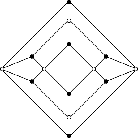 No, la formica non potrà fare il suo percorso. Schiacciate in un piano lo scheletro del rombododecaedro, come mostrato nella figura qui sotto, e colorate di bianco i vertici in cui convergono quattro spigoli e in nero quelli in cui ne convergono tre. Come vedete, un qualunque percorso alterna vertici bianchi a vertici neri; però ci sono 6 vertici bianchi e 8 neri, quindi il percorso è impossibile.