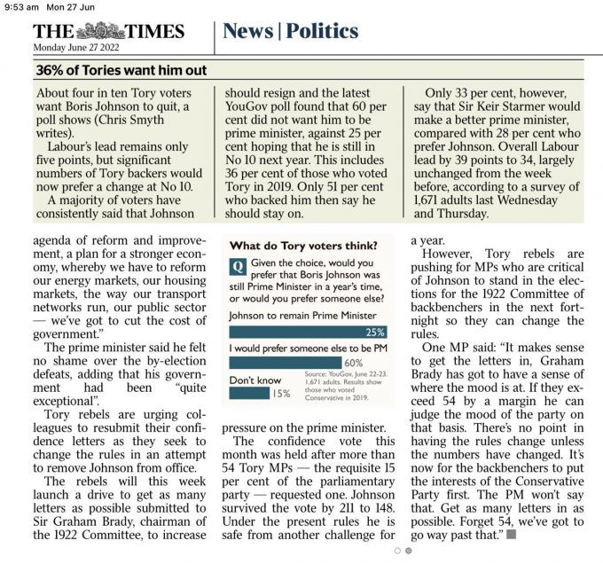 Resta solo da capire se si è semplicemente trattato di sciatteria – le barre corrispondono alle percentuali di favorevoli e contrari a che BoJo rimanga primo ministro tra chi ha votato conservatore nel 2019, come potete osservare leggendo la parte superiore dell’articolo – oppure Murdoch (o chi per lui) ha provato a vedere se qualcuno ci cascava guardando la lunghezza delle barre e non i numeri delle percentuali… Il tutto senza naturalmente escludere la possibilità che qualcuno abbia scelto apposta di mischiare due tipi di dati per aumentare la visibilità del mancato sostegno dell’elettorato a Johnson.