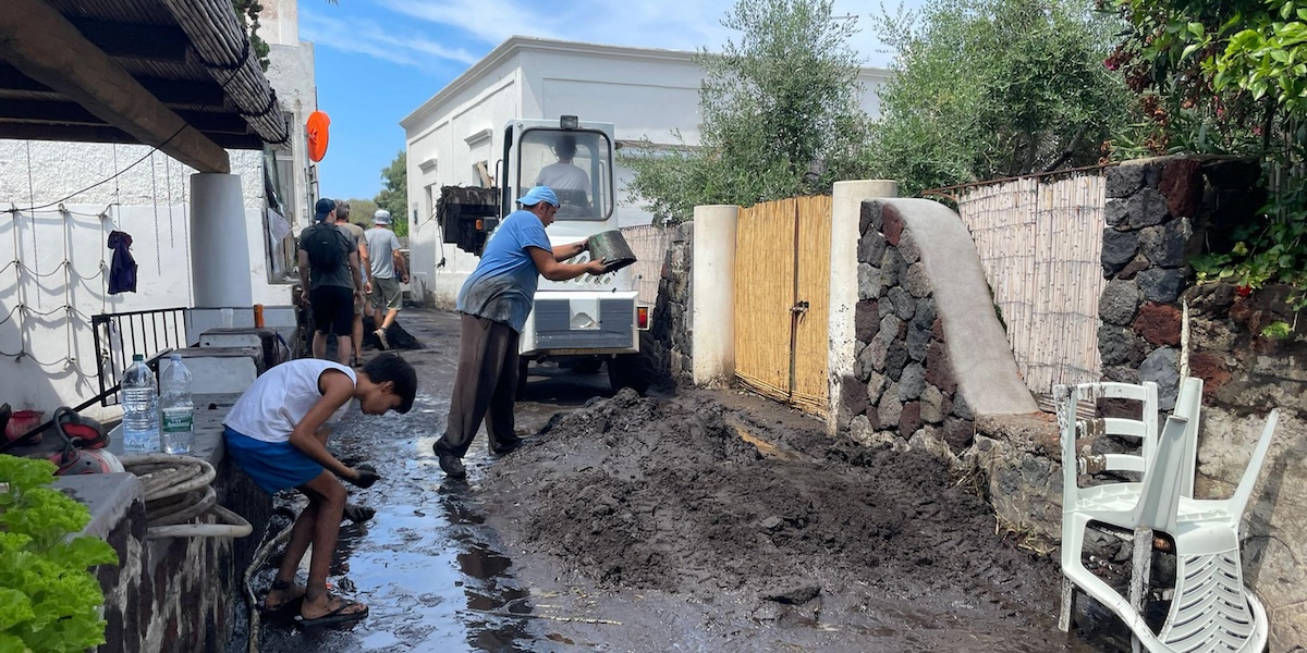 Volontari puliscono le strade dal fango dopo l’alluvione a Stromboli, 12 agosto 2022 (Mattia Morandi/Ansa)