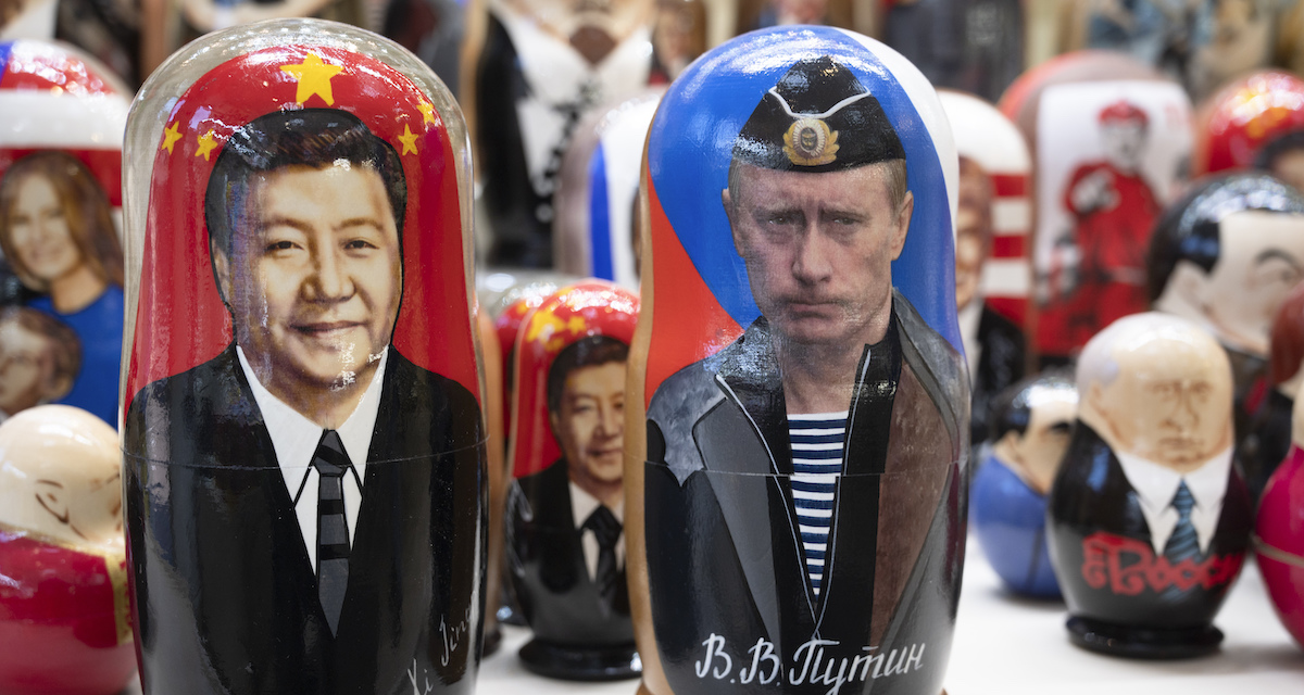 Due matrioske che raffigurano il presidente cinese Xi Jinping e quello russo Vladimir Putin (AP Photo/Dmitry Serebryakov)