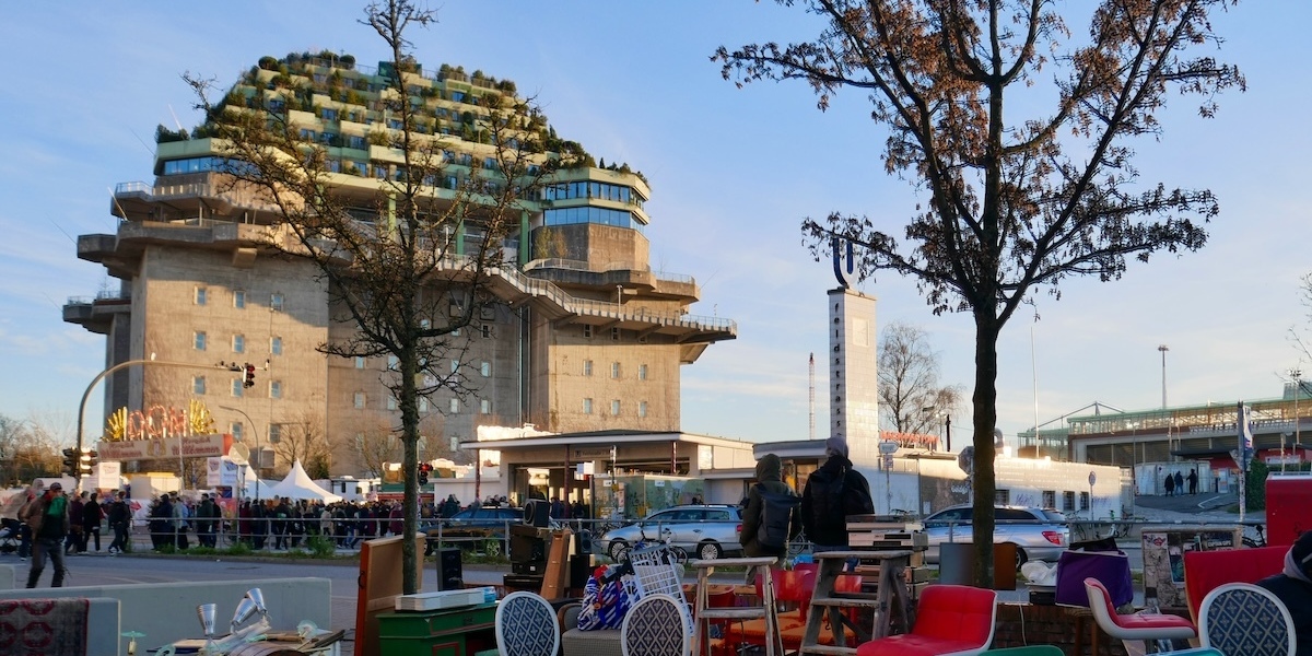 Il Bunker o Flakturm IV e, in primo piano, un mercatino vintage di Sankt Pauli, Amburgo, 30 novembre 2024 (Gianluca Cedolin/il Post)