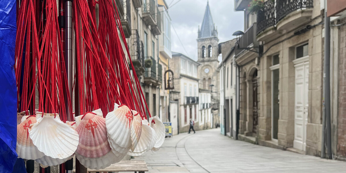 Un negozio di souvenir a Sarria vende conchiglie che i pellegrini possono legare allo zaino (Viola Stefanello/Il Post)