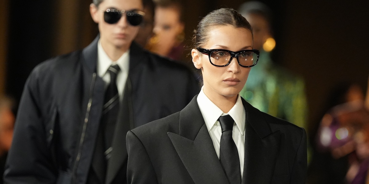 Bella Hadid con la cravatta alla sfilata di Saint Laurent, Parigi, 24 settembre 2024 (Francois Durand/Getty Images)