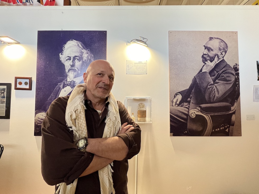 Danilo Coppe, alle sue spalle le foto di Ascanio Sobrero, inventore della nitroglicerina, e Alfred Nobel, inventore della dinamite (il Post)