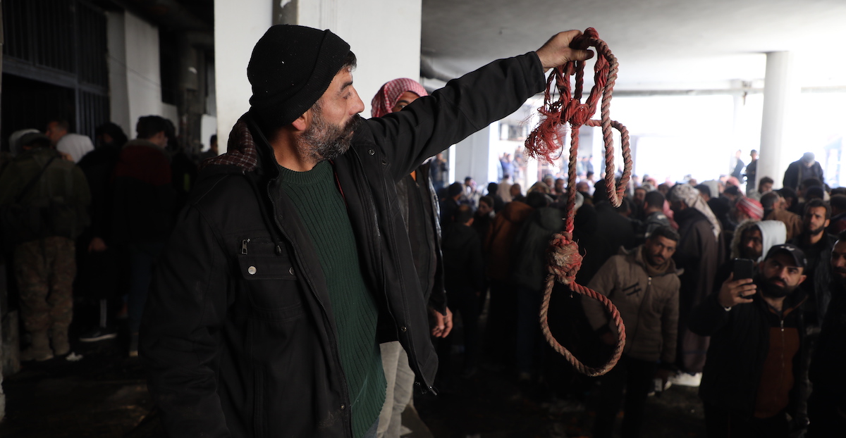 Un uomo mostra una corda dentro alla prigione di Sednaya (Ali Haj Suleiman/Getty Images)