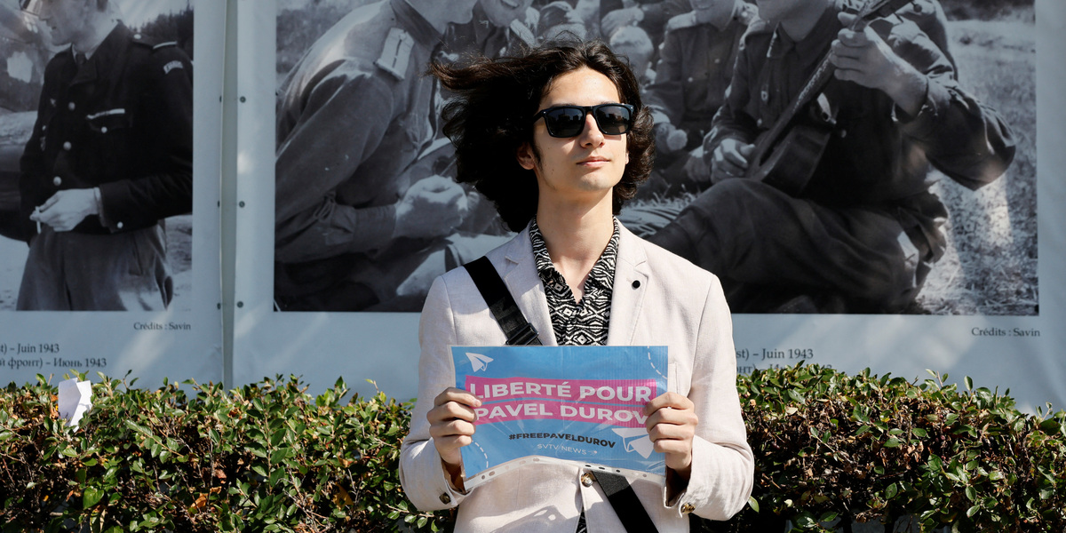 Una persona partecipa a una manifestazione di sostegno a Pavel Durov fuori dall’ambasciata francese a Mosca, il 25 agosto (REUTERS/Yulia Morozova)
