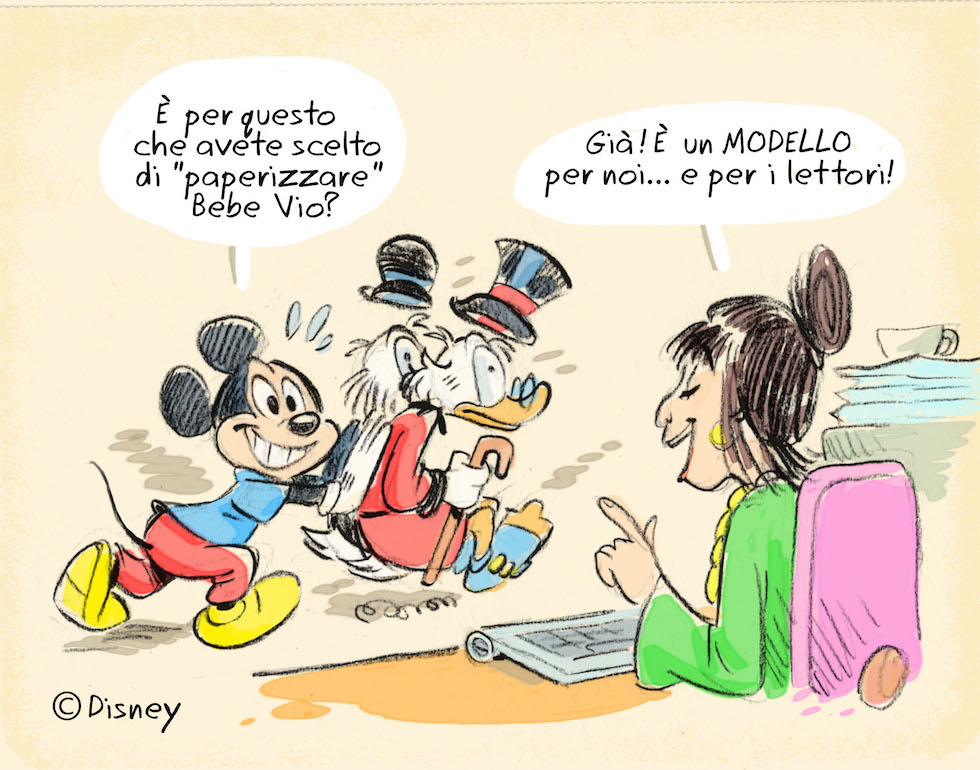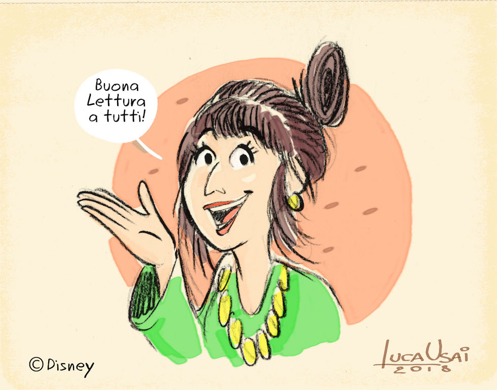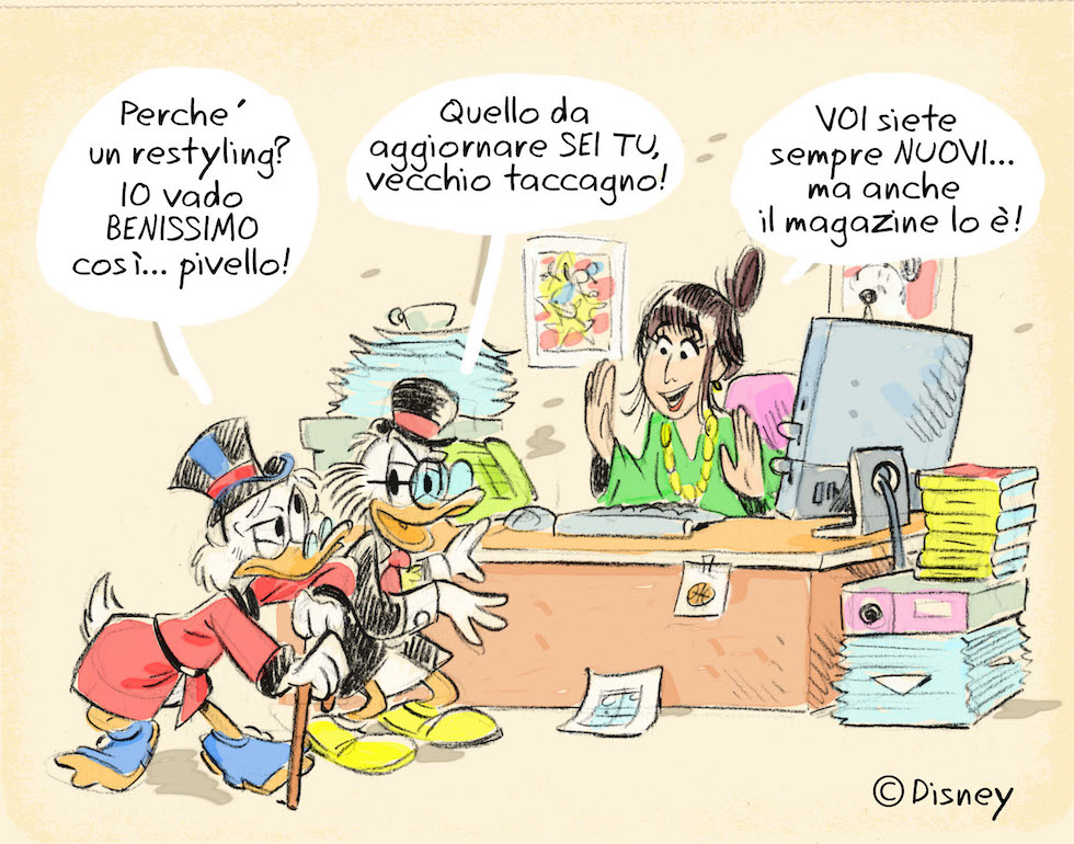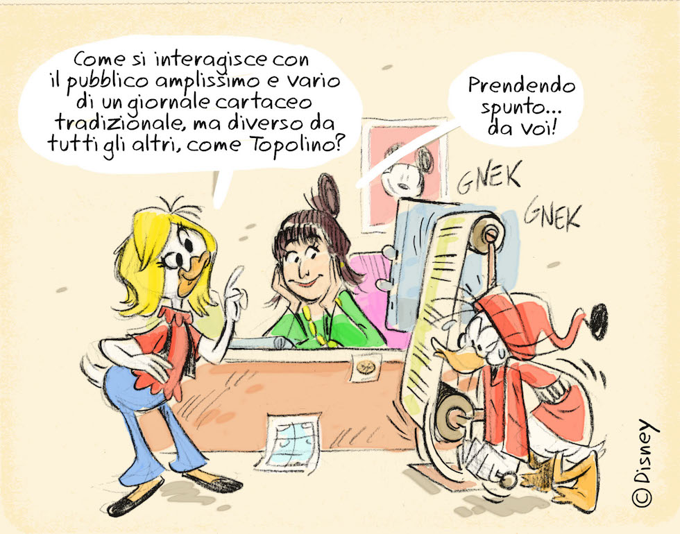 Ma come “parla”, Topolino? Lo chiedo al suo direttore, Valentina De Poli, mentre arriva in edicola il numero 3255, il primo del suo restyling, fatto di un font più leggibile (l’EasyReading, creato per facilitare la lettura, in particolare per chi è affetto da dislessia) e di un rinnovato approccio visivo, ancora più contaminato dai codici del fumetto, che resta la parte fondamentale del Topo. Proprio per questo, ho pensato di intervistare Valentina… ma a fumetti: e di far sì che siano i suoi stessi personaggi a farle le domande, nelle mie vignette disegnate dal bravissimo Luca Usai.