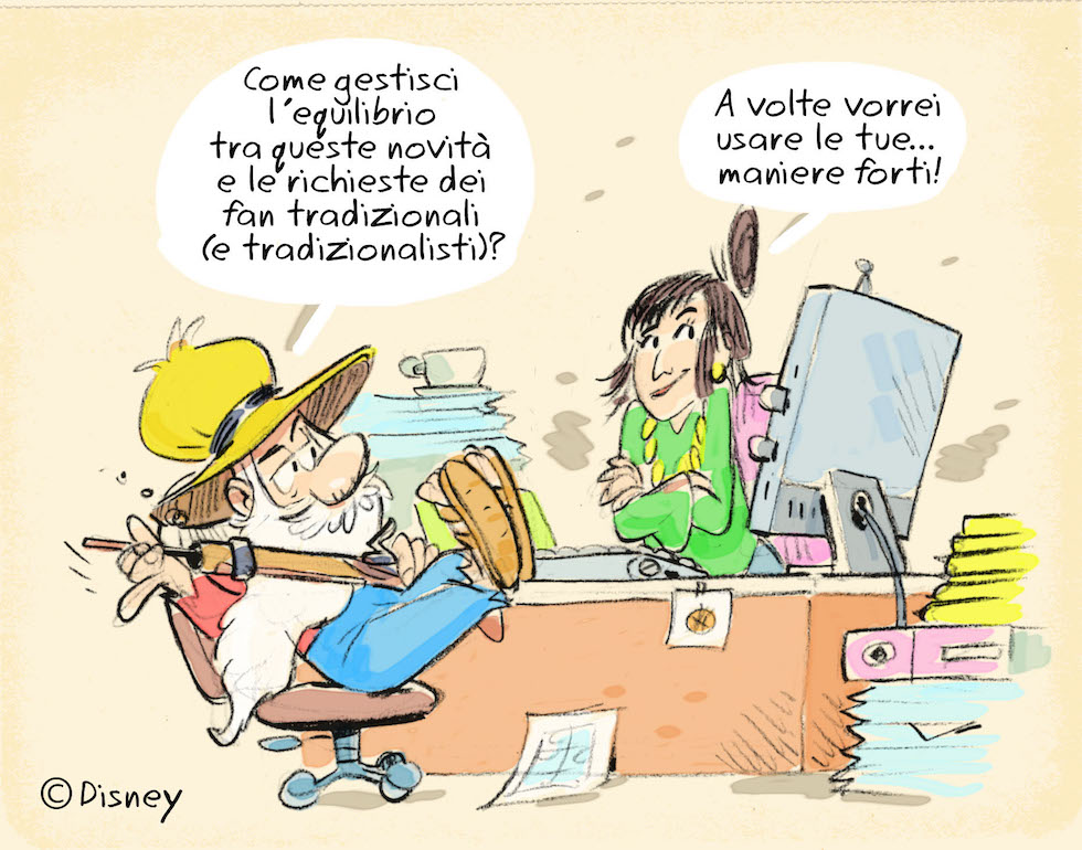 DE POLI: Io definisco sempre Topolino come un ponte generazionale: un giusto equilibrio tra novità e tradizione, tra tempi, generazioni e mondi apparentemente inconciliabili, anche nel linguaggio. Per questo manteniamo una nostra peculiarità: le famose “parole desuete” nel vocabolario dei bambini. La lingua si deve evolvere, ma sempre restando nello “stile Topolino”. Ma questo è anche e soprattutto un merito degli autori.