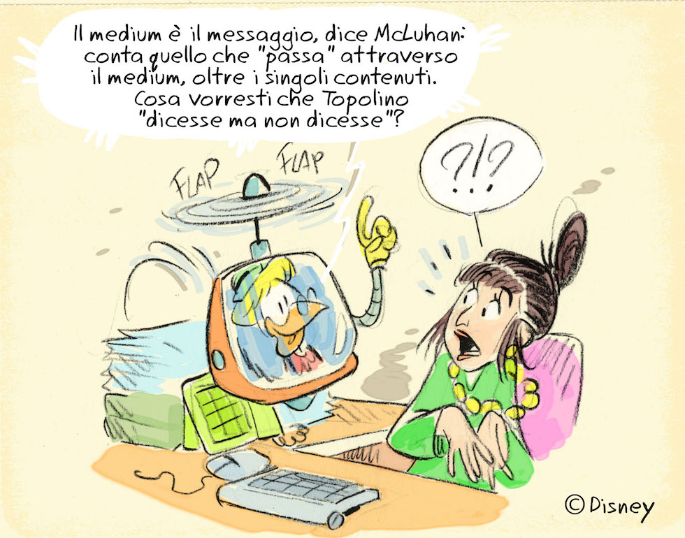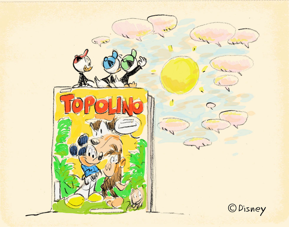 Pur essendo essenzialmente una giustapposizione di immagini in sequenza (citando Scott McCloud e il suo Capire il Fumetto), nel fumetto la parola è imprescindibile dall’immagine, e l’effetto di entrambe crea la narrazione. Il fumetto è quindi anche una palestra di innovazione linguistica. I fumetti vivono di gerghi, parole, frasi tutte loro: una loro lingua, insomma, che in quanto tale è un modo di pensare e crea un mondo. Nel caso di Topolino, poi, la lingua del giornale è un’intera filosofia editoriale e narrativa.