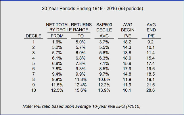 La valutazione quindi è importante come punto di partenza per sperare nel miglior rendimento futuro. Quanto è importante lo si vede dai dati nella Tabella 1 e nel Grafico 4. La prima in particolare mostra i rendimenti medi annualizzati (su 20 anni) dai periodi in cui il mercato era più caro (Decile 1, rapporto P/E iniziale di circa 18), fino ai periodi in cui questo era a più buon mercato (Decile 10, rapporto P/E iniziale di circa 10). La differenza di rendimento fra le due situazioni estreme è di oltre il 10% l’anno!