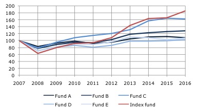 Come mostra la Figura 1 nessuno dei 5 fondi scelti (linee blu) ha avuto, finora, un rendimento superiore a quello del fondo passivo scelto da Warren Buffett (linea rossa). Ciò che rende ancora più significativo tale risultato è che i 5 fondi non sono stati scelti casualmente, ma erano stati individuati come i migliori dallo scommettitore.