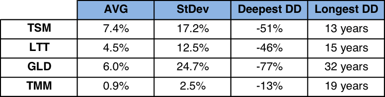 Sfruttando l’utilissimo sito portfoliocharts.com, la Tabella 1 mostra, per ogni asset class, il rendimento medio (Avg), la volatilità (StDev), la massima perdita (Deepest DD) e il più lungo lasso di tempo necessario a recuperare una perdita (Longest DD) riferiti agli anni 1972-2016 e calcolati al netto dell’inflazione.