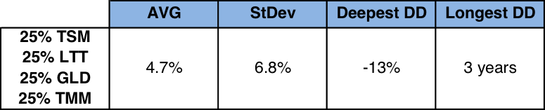 Il confronto fra le due tabelle è significativo: con l’investimento in quattro asset class si è ottenuto un buon rendimento con una massima perdita ridotta ed un lasso di tempo per recuperare dalla perdita di soli 3 anni. Ciò è frutto della diversificazione e della scelta di asset class negativamente correlate fra loro, ossia che non crescono o perdono contemporaneamente, ma la perdita di una è compensata dalla crescita delle altre.