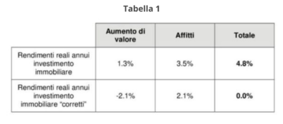 Credit Suisse rileva che il rendimento dell’investimento immobiliare è dovuto per l’1.3% all’aumento di valore dell’immobile e per il 3.5% agli affitti. Riguardo al primo termine, gli autori fanno notare che non è una stima realistica; andrebbe, infatti, corretto per tenere conto dei costi di manutenzione, della qualità degli immobili e di altri fattori di peso inferiore. A valle delle correzioni il valore degli immobili si svaluta del -2.1% all’anno.