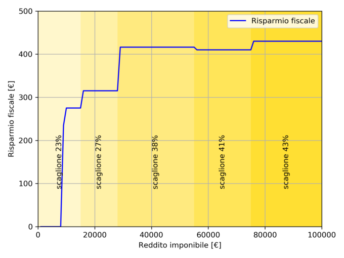 Osservando i risultati del Grafico 1 si potrebbe pensare che i risparmi fiscali legati ai fondi pensione siano modesti, almeno per i redditi più bassi, per via delle aliquote basse. E invece no. Il secondo grafico mostra il risparmio fiscale che si può ottenere versando 1000 euro in un fondo pensione, con le stesse ipotesi del primo grafico.