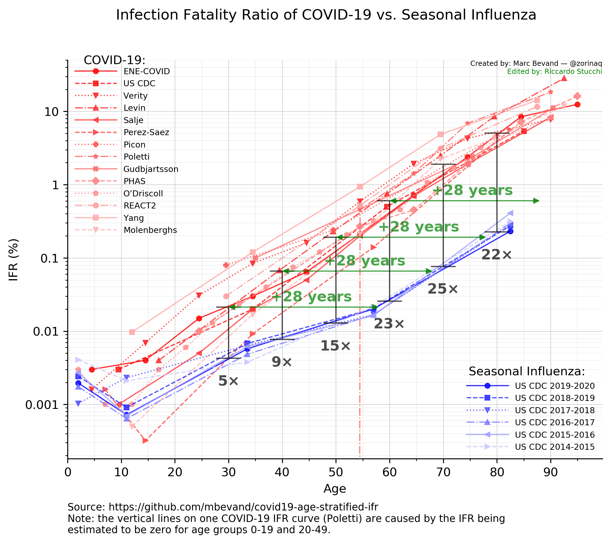 In definitiva, chi descrive la COVID-19 come “una banale influenza stagionale” dimentica di completare la frase con “…contratta con 30 anni in più”. Cosa che fa cambiare totalmente il senso della frase.