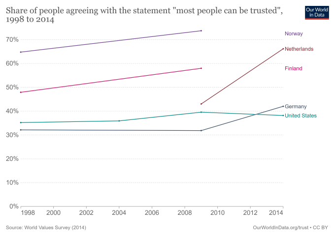 In Germania, il 42% degli intervistati risponde che in generale ci si può fidare della gente. Negli Stati Uniti un po’ meno, il 38%. In Finlandia il 58%, in Olanda il 66% e in Norvegia addirittura il 74%.