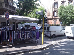 Eccolo qui, tutto l’armamentario dei bancarellari romani, una delle forme di degrado -unica in Europa, per trovare robe del genere bisogna andare presumibilmente in Africa o chissà dove- che umiliano più profondamente la città. Marciapiedi impraticabili. Raddoppio degli spazi consentiti. Bancarelle fatiscenti. Furgoni sempre rigorosamente dietro la bancarella (a far da magazzino) in rigoroso divieto e altrettanto rigorosamente palo con cartello di diveto di sosta divelto. Un classico. E poi gli osceni espositori per stampelle su ruote. C’è da ripeterlo: ci fate schifo, voi e chi vi ha autorizzato. Ah, dimenticavamo: qui siamo in pieno Trastevere…