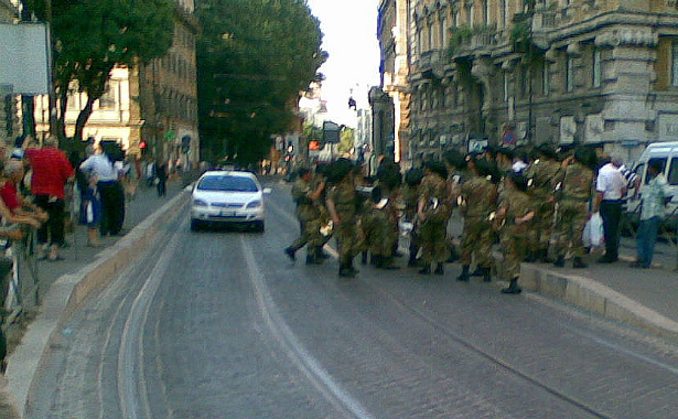 Bersaglieri si spostano al passaggio di un taxi su via Arenula (dove comunque i taxi posso legalmente transitare). Non trattavasi però di “esercito regolare”, ma probablmente di un’associazione di volontari (c’erano diversi ragazzini e persone che non avevano propriamente un fisico adatto) che si esercitava in occasione della Festa de Noantri, poco distante.