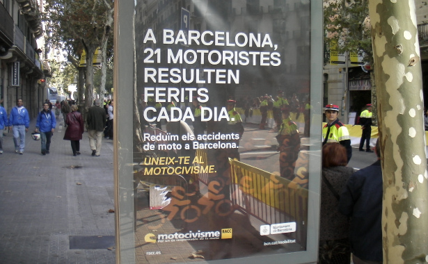 Abbiamo una campagna pubblicitaria contro gli incidenti in moto? No, non abbiamo una campagna publicitaria contro gli incidenti in moto. A Barcellona, dove probabilmente in tutta la città ce ne sono meno che di fronte a un qualsiasi liceo romano, sì. Più che altro, guidano in un modo che ci sogniamo, senza superare la linea del semaforo, né quella tra le corsie, senza guidare sul marciapiede. In poche parole: rispettano il codice della strada.