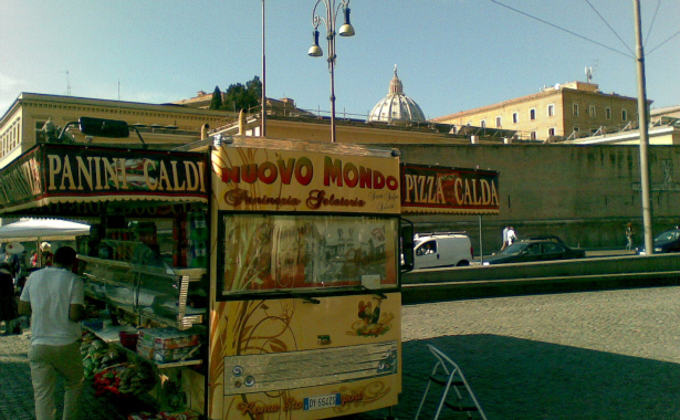 Sempre più grandi, sempre più belli. Prima o poi troveremo scritto sui camion-bar “sala interna”, o “forno a legna”, e non ci stupiremo. Questo è il modello doppio. Siamo a piazza Risorgimento, riqualificata dieci anni fa ma con l’oggetto misterioso nell’esatto centro. Sullo sfondo a sinistra, tanto per non farsi mancare niente, una bancarella.