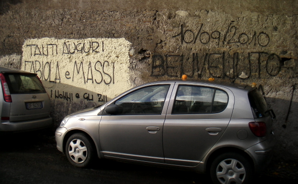 Dirlo a tutti. Non solo al Grassi di Ostia, qui siamo sul retro del San Giovanni Addolorata e la stra-bizzarra usanza di annunciare le nascite sui muri non conosce confini, e neanche età: a quanto pare anche i nonni sono avvezzi all’uso della bomboletta.