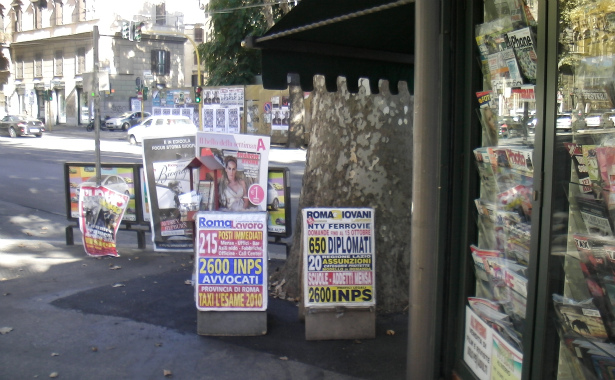 Di tutto tanto. Giornalaio favela, parapedonali pubblicitari, rattoppo del marciapiede fatto a casaccio, palo nudo con volantino, manifesti abusivi. Chiudiamo l’anno con la solita e non difficile da scovare foto piglia-tutto.