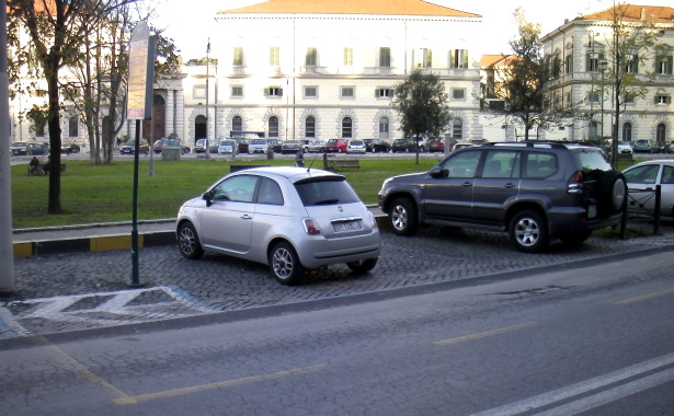 Si può fare. In quale stanza di quale museo è conservato il vasetto con la testa di chi ha progettato una cosa del genere? Nessuna, e di illegalità legali di questo tipo se ne vedono diverse. Qui la striscia blu è immersa nella fermata dell’autobus. Così si crea confusione generale, dando un’ulteriore arma ai mascalzoni per farla franca. In ultima analisi, tutto questo contribuisce a ingrossare l’ottavo colle, cioè la pila dei ricorsi al Giudice di pace per le multe.