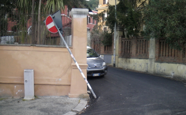 Succede in una stradina di Monteverde, ma potrebbe accadere ovunque, e si cerca qui di coglierne la morale generale. All’apparenza niente di strano, un cartello storto, e che sarà mai, sempre sperando che non ci legga qualcuno dalla Svezia. Ma poi, guardando meglio (non solo gli adesivi dei traslocatori) si scopre che il cartello cade per un’auto in divieto di sosta (a proposito, ma nello spot con Proietti sulla sicurezza stradale la potevano togliere la macchina in divieto sullo sfondo, no?), e resta evidentemente così mettendo in pericolo l’incrocio.