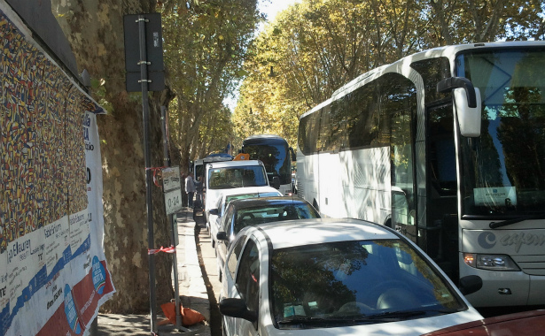 Pianto pullman. Premesso che qualsiasi “piano” che preveda l’ingresso dei pullman all’interno del Grande raccordo anulare è da considerarsi criminale (ok, esageriamo), la situazione è questa. Sosta in doppia fila, parcheggi occupati (quelli in fondo), passeggeri che scendono come viene.
