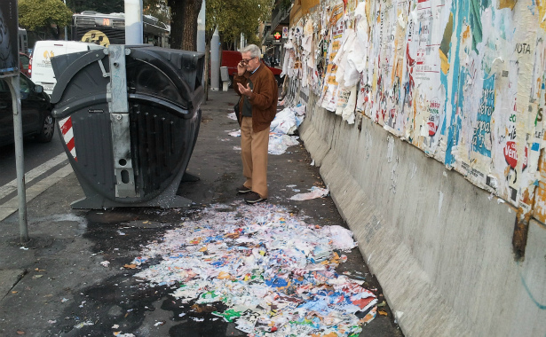 Il caos dopo la tempesta. Dopo l’alluvione del 20 ottobre scorso questo signore, che mi ha autorizzato a pubblicare la sua foto, si è preoccupato per diverso tempo di non far scivolare nessuno sulla melma cartellonara abusiva (e si scivolava alla grande), nel tristemente noto tratto di viale Trastevere. Intanto era al telefono per cercare di far intervenire qualcuno, ma il problema è – come dire – a monte.