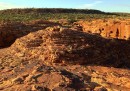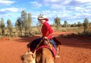 Per cena, servono spezzatino di canguro e insalata, davvero ben preparati. Il falò scoppietta, affumica, illumina, riscalda. Il clima della tavolata, con gli altri ospiti del lodge è conviviale. Chi è già andato, racconta del trekking nel canyon. Tre ore di cammino non faticoso, e viste maestose: a perdita d’occhio, solo natura, oasi verdi, piante sconosciute, minuscoli laghetti con palme giganti, e poi roccia, roccia rossa, stratificata, spaccata, solo roccia. La stessa che si vede per chilometri e chilometri sorvolando la zona in elicottero. Solo così si può capire la grandiosità degli spazi liberi, un concetto che visivamente si avvicina all’infinito, dove pascolano mandrie di bovini e cammelli (l’Australia, in particolare il Red Centre, è il posto dove ce ne sono di più al mondo: 2 milioni!).