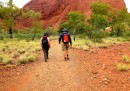 Kings Canyon è una catena di montagne con orridi che la spaccano e il percorso del fiume, asciutto, in fondo. Lo scenario è struggente, desolato, selvaggio. Ci sono una stazione di servizio (Kings Creek Station) e due alberghi. Oddio, alberghi non è proprio il termine giusto. Uno è un mega-resort, il classicone per turisti, l’altro è un lodge con dieci tende. L’accoglienza al Wilderness Lodge (www.aptouring.com.au/travel-styles/Wilderness-Lodges/Northern-Territory) è aussie-style, un concetto di informalità peculiarmente australiano che si apprezza subito. Want a Coke? Then I’ll show you your room.