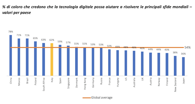 E l’Italia sorprende per Tech-love. Il dato nazionale è sopra la media globale ed è superiore a tutti gli altri paesi europei, quando si indaga il sentiment positivo nei confronti della tecnologia.